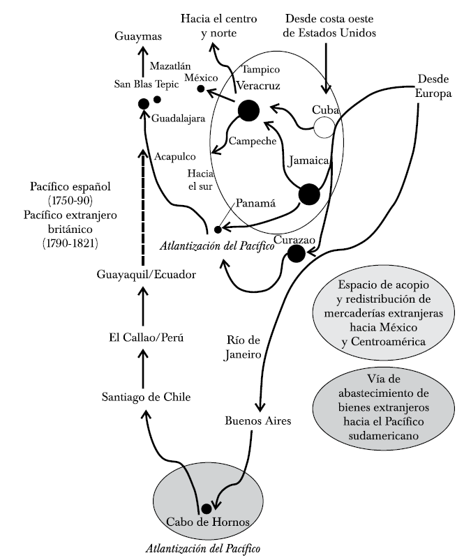 Decíamos que la apertura de Cabo de Hornos fue la primera ola de atlantización que sufrió el Pacífico, rompiendo las lógicas comerciales que existían previamente por aquel lago indiano. Existió una segunda ola, en este caso más tardía y por el frente norte y mexicano, que contribuyó a que la amplia área marítima del occidente hispanoamericano se "atlantizara". Nos referimos al contrabando británico que enlazó los nudos portuarios de Jamaica, Panamá y San Blas. Apenas iniciado el siglo xix se registró una verdadera invasión de mercaderías británicas movilizadas, en especial del rubro de textiles, a través de pequeñas embarcaciones locales e inglesas que entraron por los puertos occidentales de México. Esta segunda corriente de atlantización, llegada desde el Caribe al Pacífico mexicano fue la que, sin dudas, le propinó el último golpe a un moribundo Galeón de Manila.