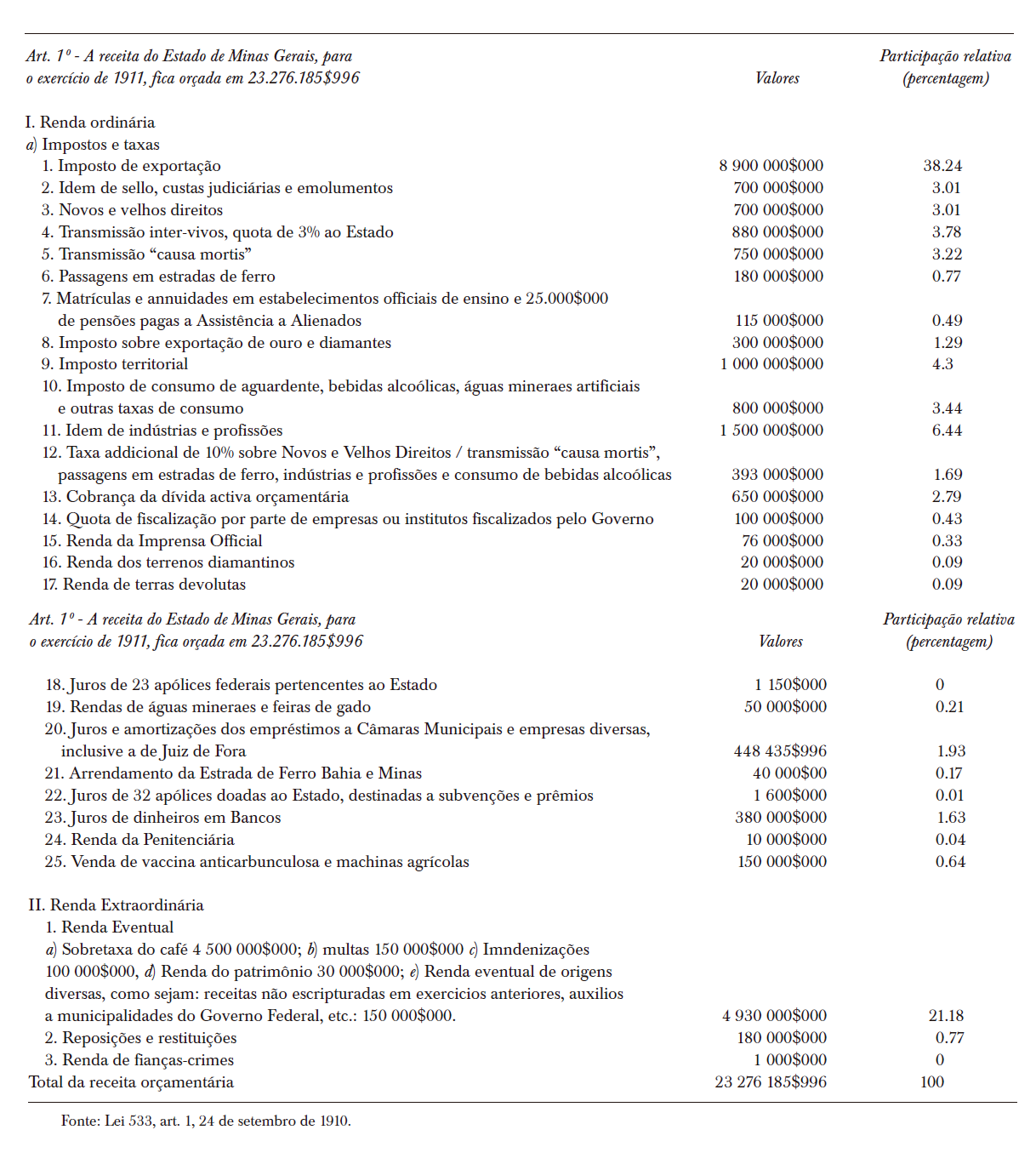 O tabela 2 relaciona a arrecadação prevista para o exercício de 1911, conforme autorização definida pela Lei 533, de 24 de setembro de 1910 (Collecção, 1911, pp. 23-37). Nas receitas orçamentárias para 1910, portanto em ponto intermediário da República Velha, podem ser observadas consideráveis alterações em relação ao início do período. As receitas subdividiam-se em renda ordinária e renda extraordinária e a participação relativa das diversas receitas estava algo diluída, não vigorando excessiva concentração em uma ou poucas rubricas. O imposto de exportação, embora permanecesse como o principal componente da receita, perfazia participação bem inferior a que apresentava no final do século XIX: 38.2% da renda total. A segunda maior participação relativa é a da cobrança da sobretaxa do café (cuja inclusão entre as rubricas da renda extraordinária denota seu caráter eventual), com 19.3% da receita total. Somada a participação destas duas rubricas à do imposto sobre exportação de ouro e diamantes (1.3%), verifica-se que o comércio exterior, apesar de em menor patamar, ainda era responsável por 58.9% da arrecadação do Estado.