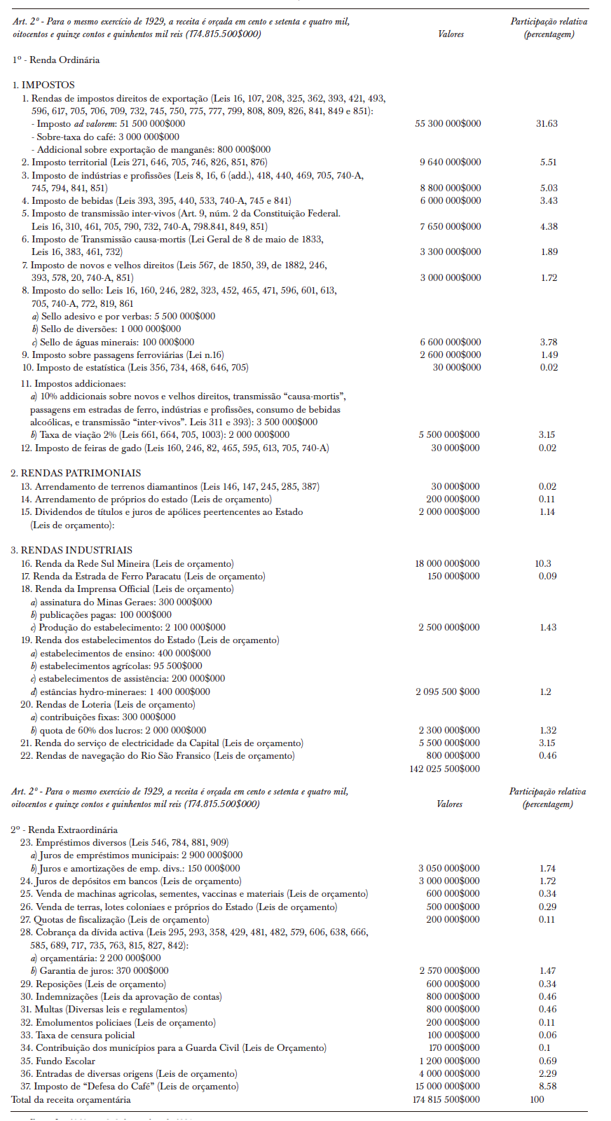 O tabela 3 apresenta o detalhamento das receitas estimadas para o ano fiscal de 1929, conforme autorização contida na Lei 1.060, de 2 de outubro de 1928 (Collecção, 1929, pp. 101-108). Constatam-se evidentes aperfeiçoamentos na elaboração do orçamento, apresentado de forma mais estruturada e racionalizada. Reitera-se também a menor dependência da receita para com alguns poucos tributos, vigorando melhor distribuição da arrecadação orçamentária. As receitas se subdividiam em renda ordinária (81.2% da arrecadação) e renda extraordinária (18.8% da arrecadação).