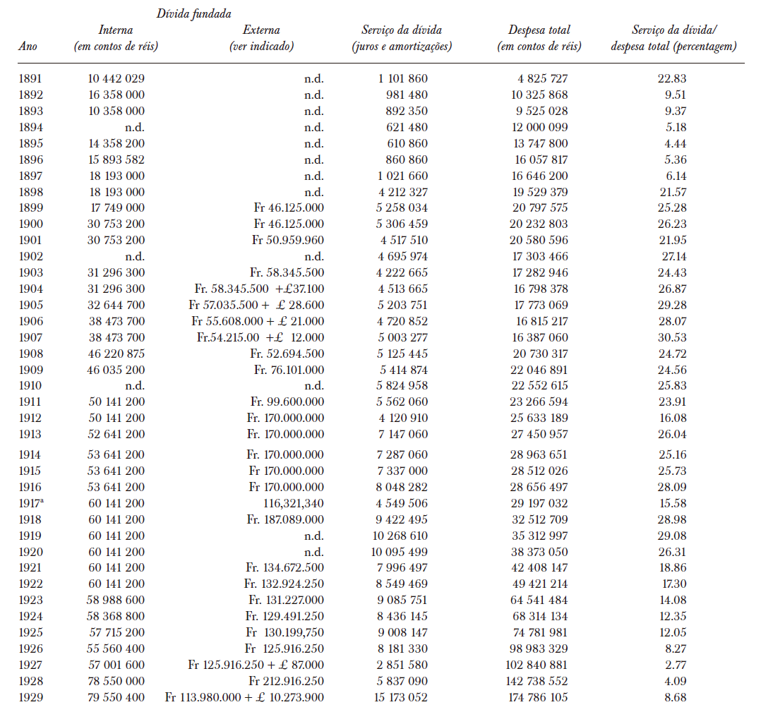17 Wirth avaliou nos mesmos termos a evolução do serviço da dívida, que “era, em média, 20% do orçamento real entre 1897 e 1923” (1982, p. 288).